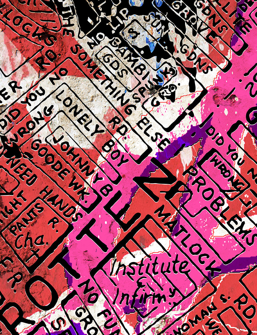 Vintage distressed vibes, hand-scrawled over the real '70s map layout (straight from A–Z, full permission) – hitting those exact spots where young John Lydon auditioned at the SEX shop and the Pistols ignited.