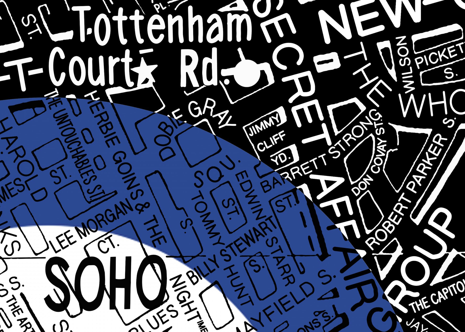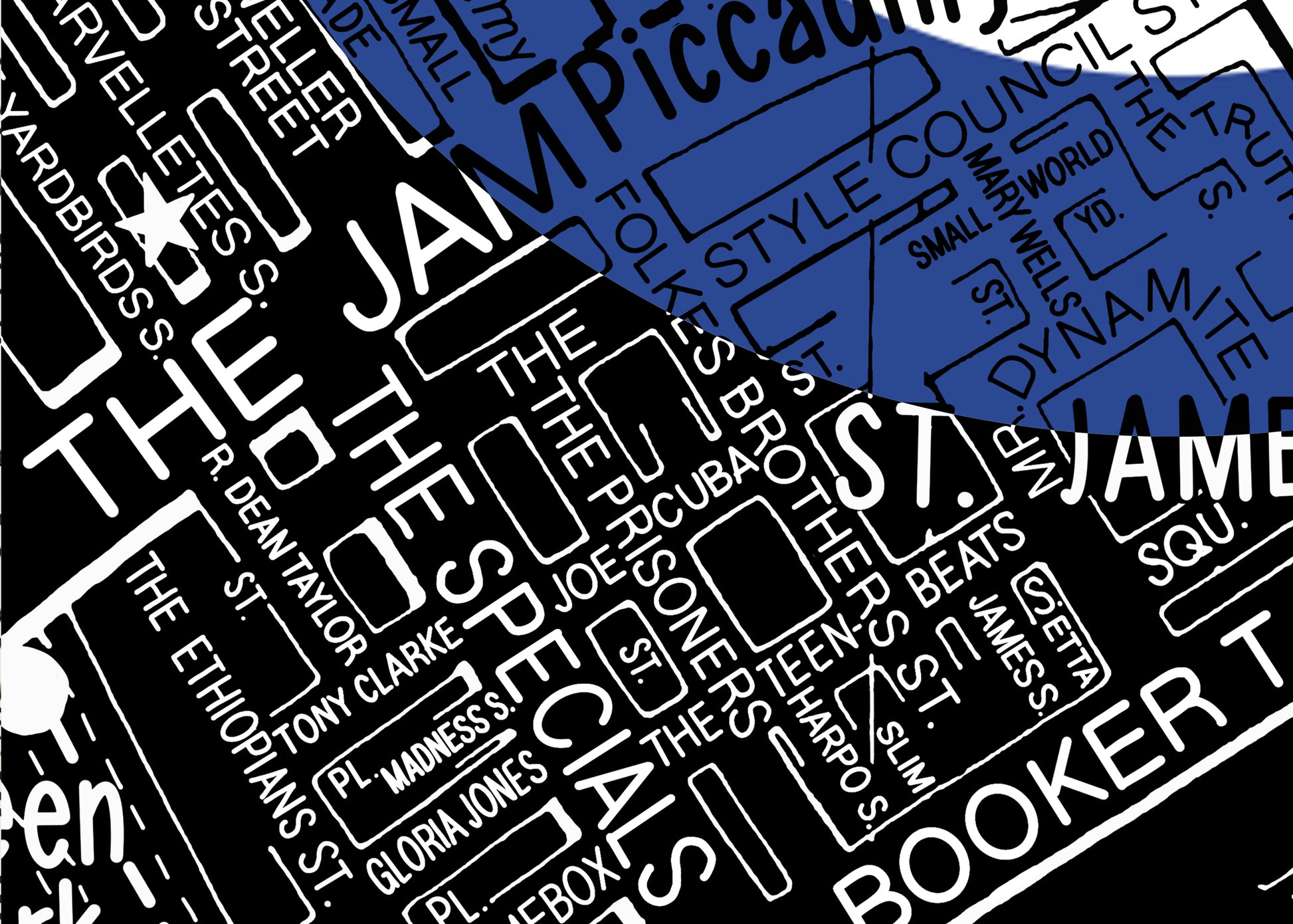 This full colour design captures the real 1960s Soho roads and landmarks – but with streets and spots renamed for Mod songs and legends, from era-defining hits by The Who and Small Faces to one-hit wonders.