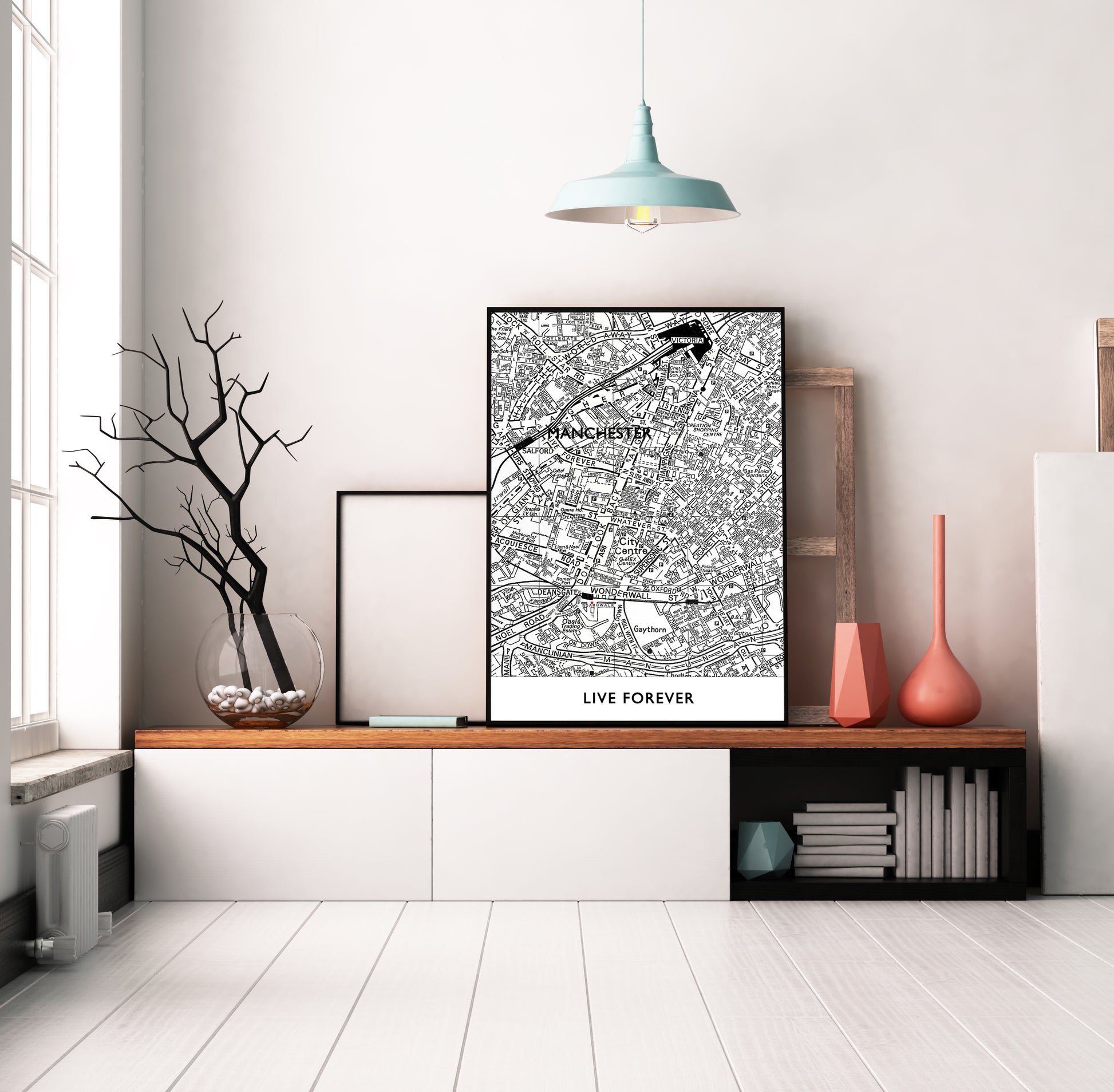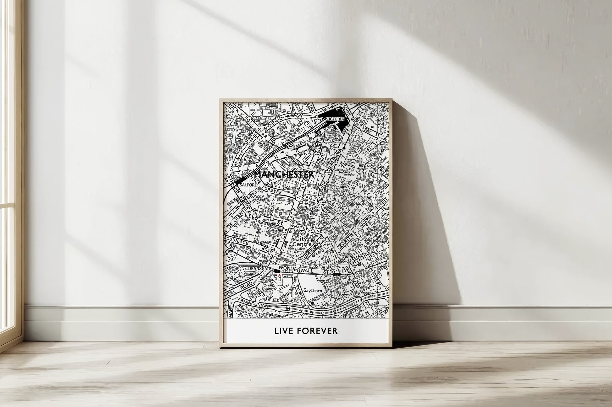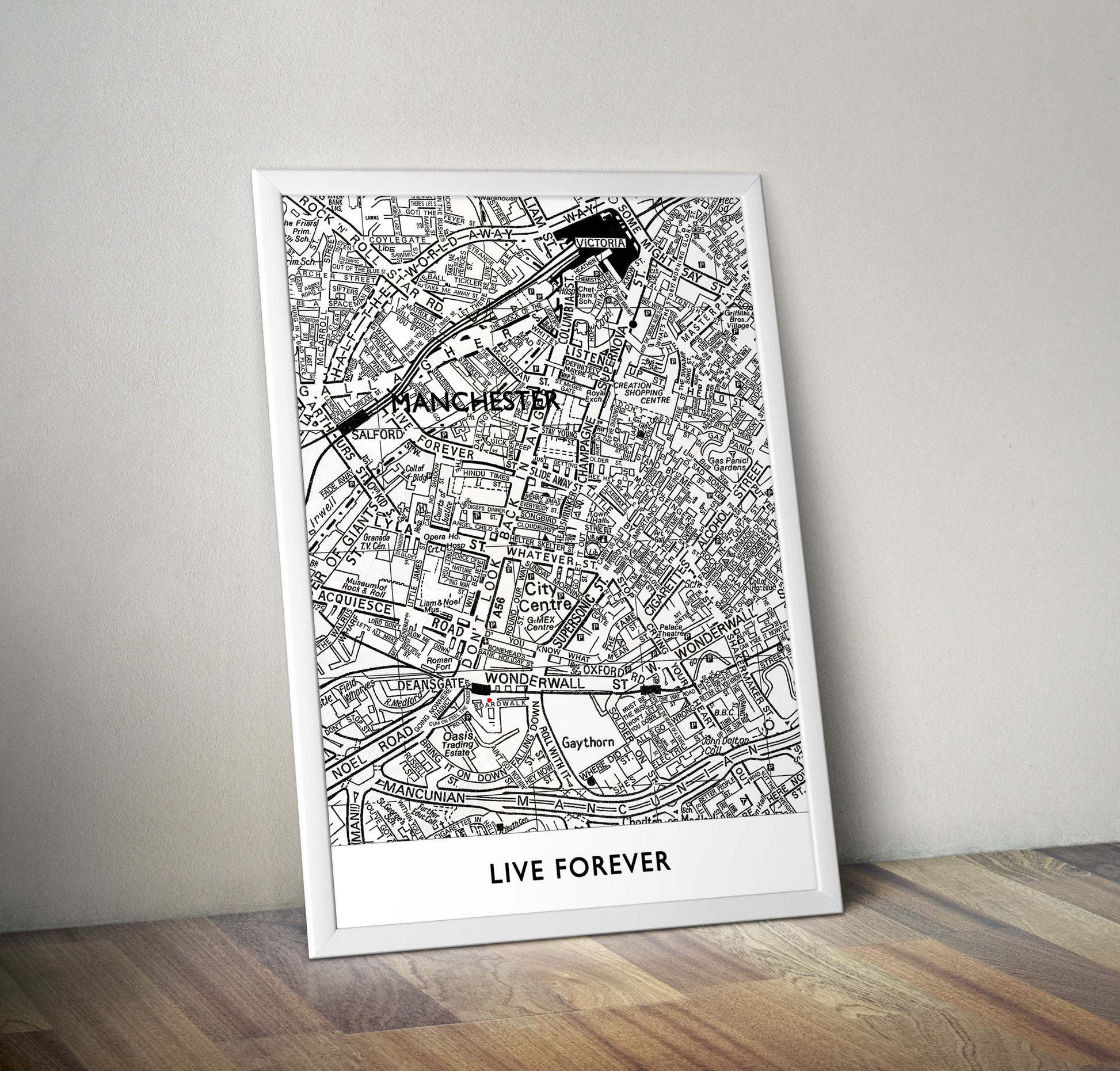 Celebrate Oasis' legendary impact on Manchester with this lovingly handcrafted 'Live Forever' Street map in traditional black and white.
