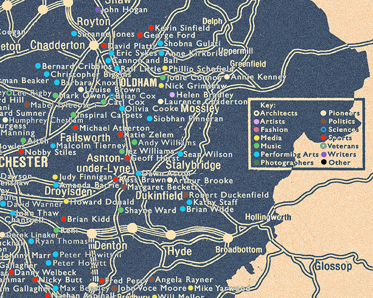 With a colour code for areas of expertise, immerse yourself in the creativity, innovation, and spirit of Greater Manchester like never before. Discover the incredible impact its residents have made on the world and celebrate their stories in this one-of-a-kind design.